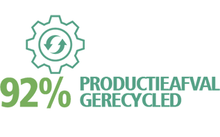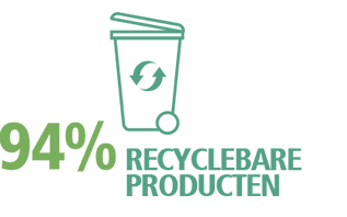 We hebben de afvalinzameling in de productie en opslag verbeterd, maar door de lagere ordervolumes is ons recyclingpercentage licht gedaald naar 93%.