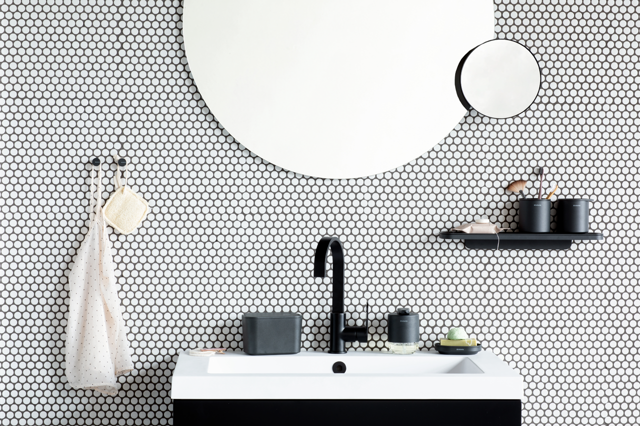 Wie etwa Seifenspender, Zahnbürstenhalter, Aufbewahrungsdose, Seifenschale, Badezimmerspiegel und Abfallbehälter. Außerdem sind passend dazu ein Badezimmerregal, ein Handtuchhalter, ein Satz Handtuchhaken und eine Duschablage mit Abzieher erhältlich. Und die Toilettenbürste mit Halter, der WC-Butler, der Toilettenpapierhalter, der Toilettenapierhalter mit Ablage, der Toilettenrollenspender und ein WC-Zubehörset vervollständigen die Kollektion.