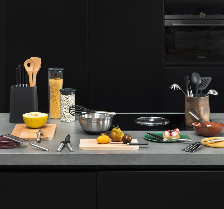 En total, la línea Profile de Brabantia ofrece casi 60 utensilios de cocina, cuchillos y tablas de cortar fabricados en un tono metal y negro atemporal o en madera de haya. Líneas limpias, puro diseño y la más alta calidad - ¡los nuevos utensilios de cocina Profile seguro que harán que te entren ganas de cocinar!