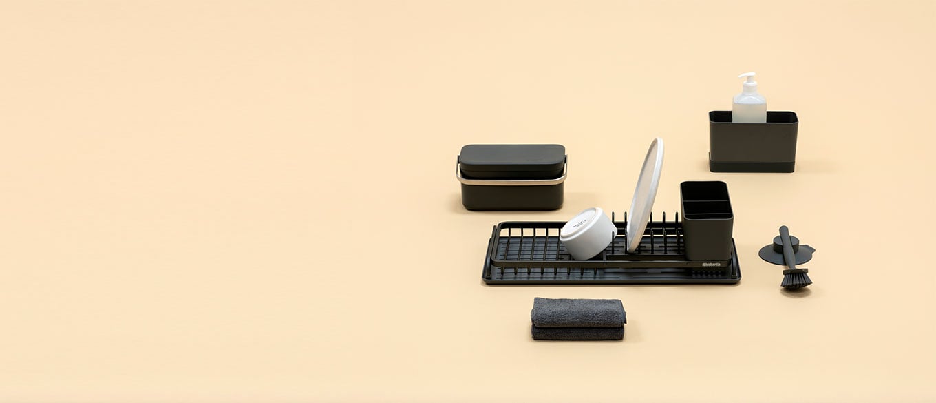 De quoi d'autre avez-vous besoin pour garder votre évier cuisine propre et bien rangé ? Organisez-vous avec style grâce à notre organiseur pour plan de travail et à notre poubelle de table d'une très grande praticité. Avec les accessoires Brabantia dédiés au nettoyage de la vaisselle, cette tâche ménagère redeviendra un véritable plaisir ! Choisissez un petit ou un grand égouttoir, une brosse à vaisselle avec support et des chiffons en microfibre.