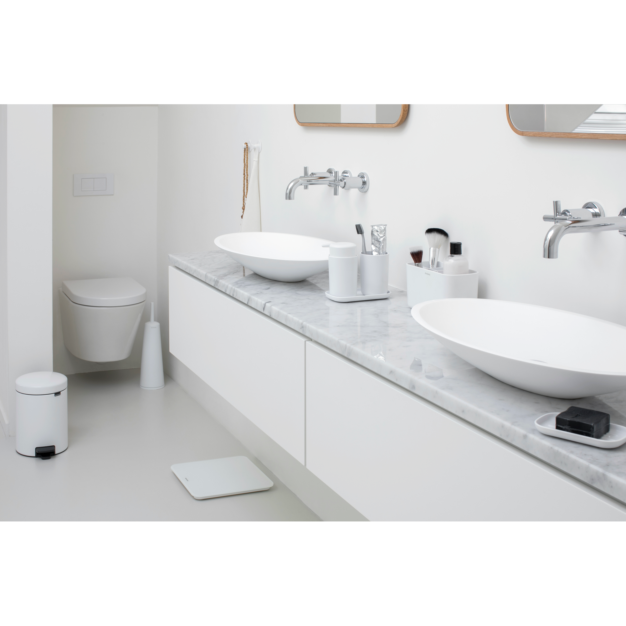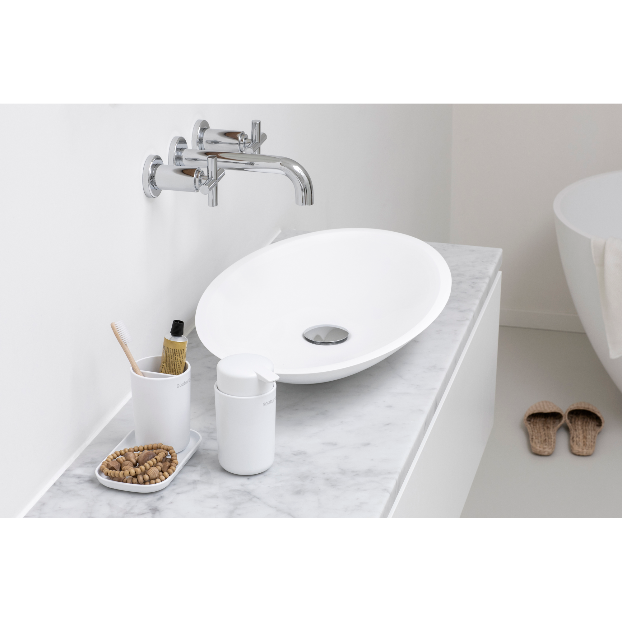 - De witte badkamerproducten van onze ReNew collectie, met zeeppompjes, zeepbakjes, drinkbekers, pedaalemmers, douchewissers, handdoekhaakjes, toiletborstelhouders en meer;