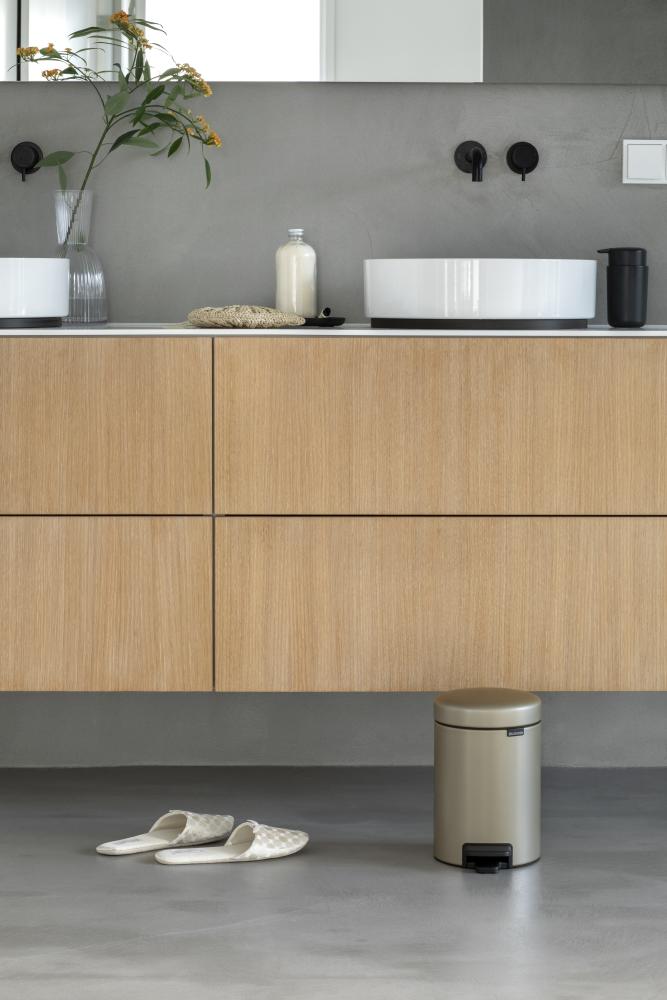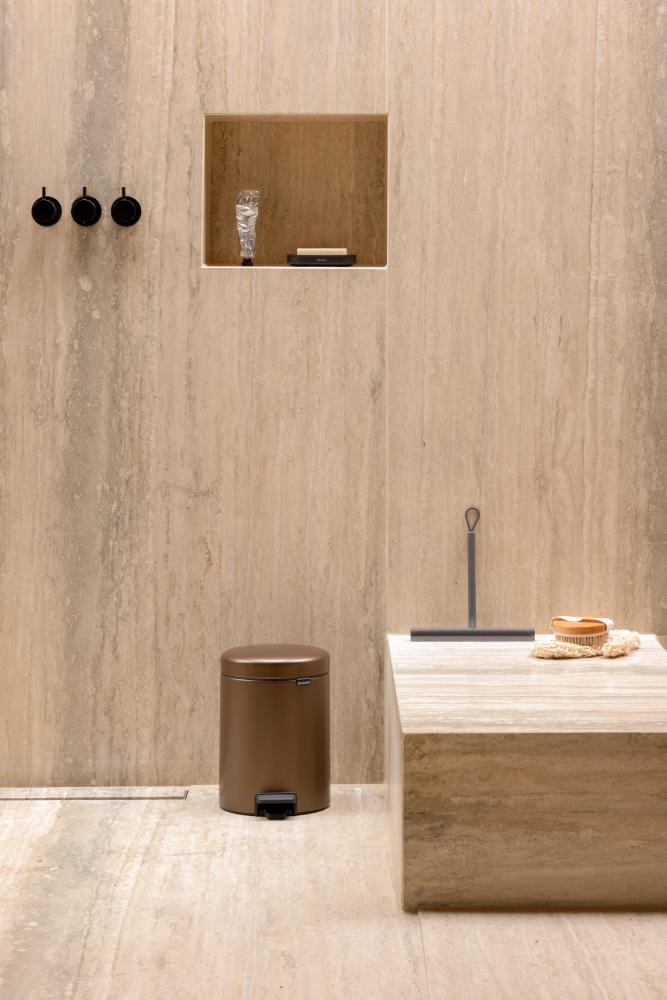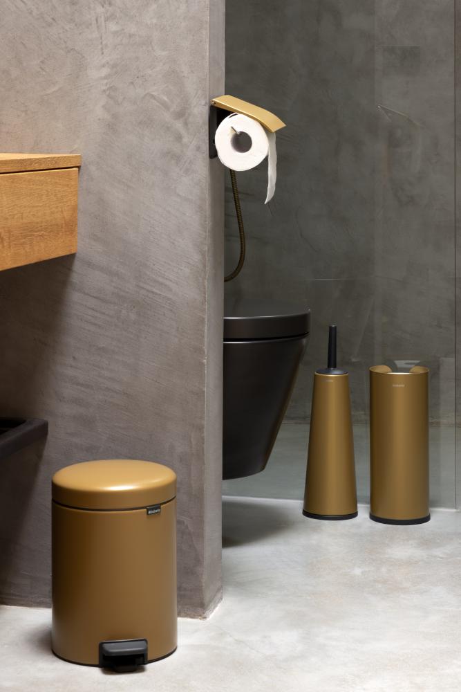 Minęły już czasy zimnego chromu. W jego miejsce wprowadzono cieplejsze odcienie, takie jak szczotkowany mosiądz, miedź i złoto. Tego typu wykończenia są jednocześnie eleganckie i delikatne, dodając głębi i światła nawet w najprostszych wnętrzach. Niezależnie od tego, czy jest to kosz na śmieci w odcieniu złotym, armatura w kolorze soft-metal czy lustro w ramie, akcenty te tworzą spokojną, spójną atmosferę — taką, jaką znajdziesz w odpowiednio zaprojektowanym wnętrzu hotelu.